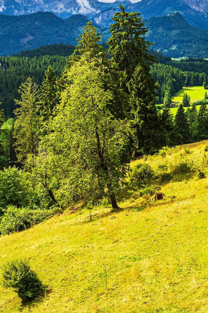Kuh auf dem Isenberch mit den Alpen im Hintergrund.