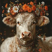 Das Porträt fängt die friedvolle Ausstrahlung einer Kuh, gekrönt mit einem liebevoll arrangierten Blumenkranz, in einer Darstellung voller Anmut und Natürlichkeit ein. Das Zusammenspiel der sanften Farbtöne des Kranzes mit dem cremigen Fell der Kuh erzeugt eine Bildkomposition, die Ruhe und ländliches Leben zelebriert. Dieses Bild, das…