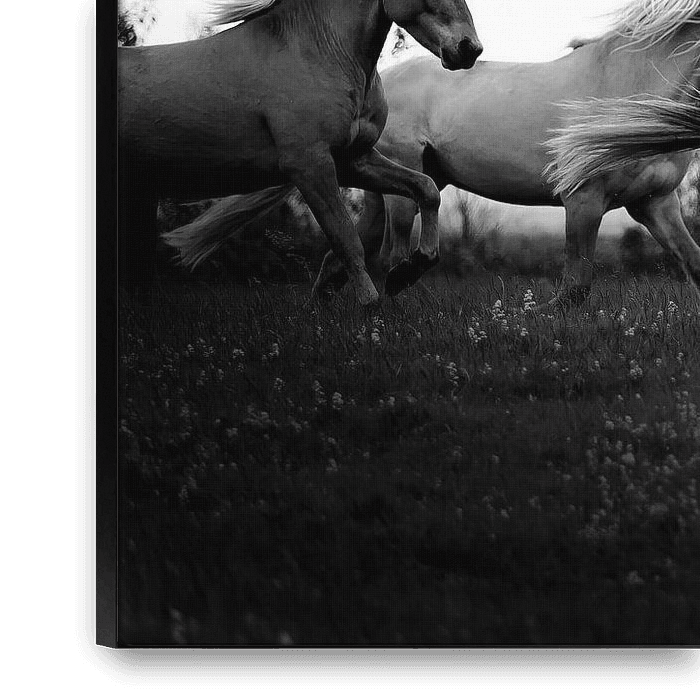 Dieser Kunstdruck von Pferden gibt mir das Gefühl von "Wow". Eleganz, Stärke, Freundschaft und wilde Natur kommen in einem Schwarz-Weiß-Foto zusammen.