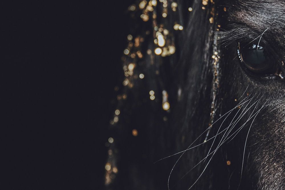 Nahaufnahme eines Friesenpferdes mit goldenem Glitzer. Die Details sind deutlich sichtbar, die goldenen Glitzer, das Haar in der Nähe der Augen, sondern auch die Augen selbst sind schön hell und heben sich gut in diesem Fine Art Portrait mit schwarzem Hintergrund.