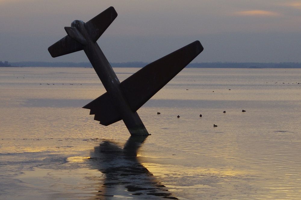Kunstwerk in de haven van Harderwijk, bij ondergaande zon, en een ijsvlakte