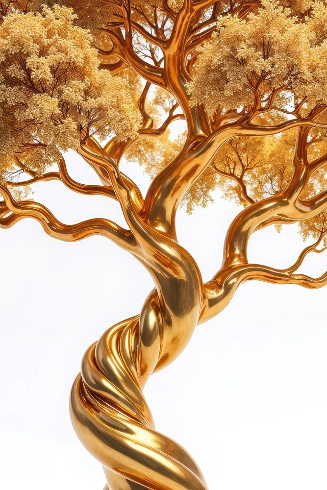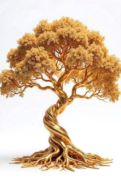 Ein gewaltiger Baum aus fließendem Gold erhebt sich in harmonischer Bewegung, seine gedrehte Form wirkt lebendig, als würde sie sich stetig weiterentwickeln. Die Wurzeln greifen tief und kraftvoll in den Boden, während die Krone sich in feinster Verästelung entfaltet und das Licht in tausend sanften Nuancen einfängt. Jeder Ast, jedes…