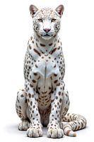 In stiller, souveräner Präsenz sitzt der Leopard im Zentrum der Komposition, seine Erscheinung von eleganter Kraft und makelloser Klarheit geprägt. Sein Fell zeigt sich in einer außergewöhnlichen, hellen Weißheit, durchzogen von präzise gesetzten, warmen Flecken, die wie kunstvolle Ornamente wirken. Jede Linie seines Körpers ist weich…
