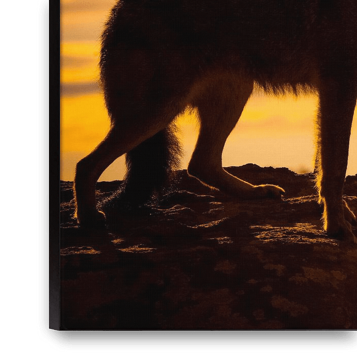 Bestelle das Foto LPH 71126315 Wolf weint bei Sonnenuntergang, Kalifornien von BeeldigBeeld Food & Lifestyle als Reproduktion auf Leinwand, Alu-Dibond, als Poster, Fototapete oder Acrylglasbild.