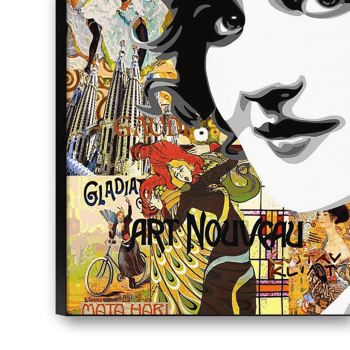 Ein Porträt von Lily Elsie aus der Serie "Nimm dir Zeit" auf einem Hintergrund aus Jugendstilbildern, historischen Bildern, Marken, Gebäuden und Gegenständen von 1900. Das Originalgemälde (ein mit Acryl gemaltes Porträt auf einem gedruckten Hintergrund auf Leinwand) ist direkt bei den Künstlern in der Größe 1,00 x 1,00 x 4 cm erhältlich.