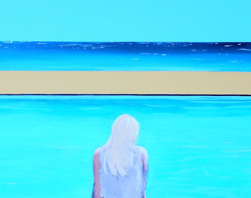 Frau vor einem Pool, mit Meerblick.