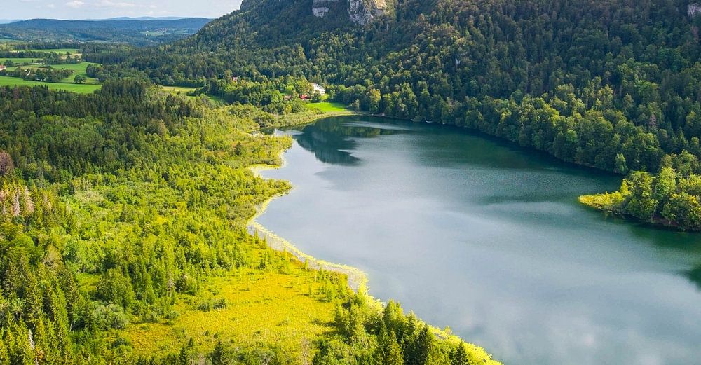 Blick auf den von Wäldern umgebenen Lac de Bonlieu im französischen Jura