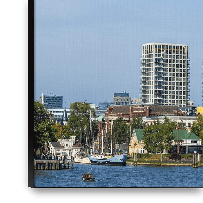 Bestelle dieses Rotterdam-Wandbild Lachshafenturm und Skyline von Rotterdam, Niederlande von Adelheid Smitt als Reproduktion auf Leinwand, Alu-Dibond, als Poster, Fototapete oder Acrylglasbild.