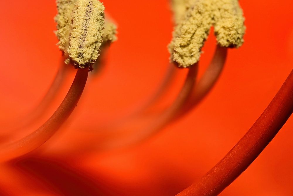 Makroaufnahme des Blütenstand einer roten Lilie. Im Fokus stehen bei der Nahaufnahme der Blütenstempel mit Griffel und Narbe sowie die Staubbeutel.