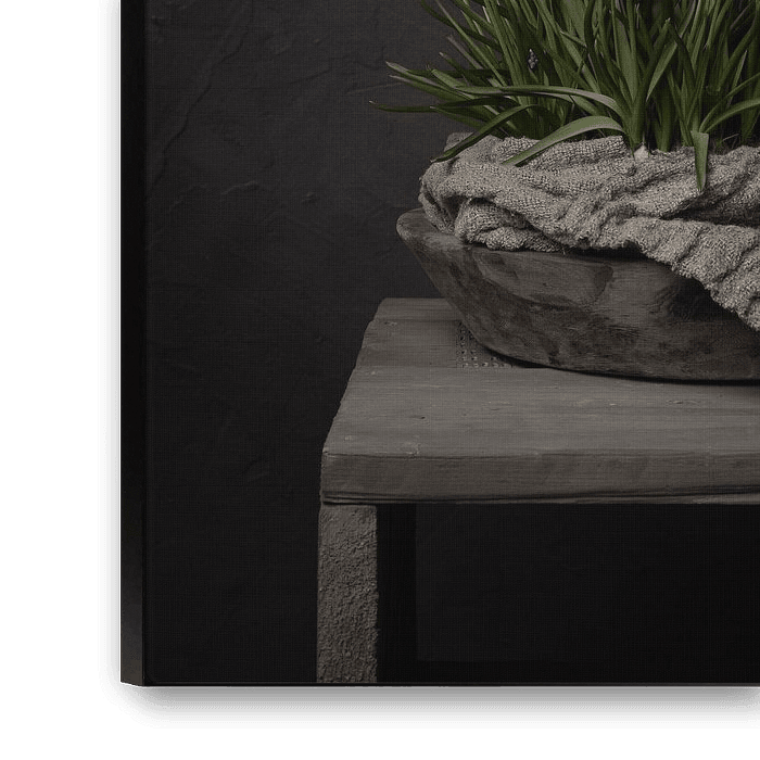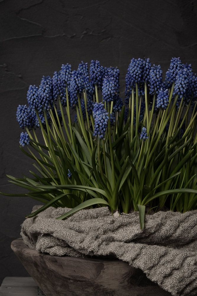 Ländliches Stillleben mit blauen Weintrauben in einer Holzschale. Das Ganze steht auf einem alten Gerüstholztisch. Es handelt sich um ein dunkles Stillleben mit schönem, weichem Licht aus einem Fenster, über dem Rand der Holzschale hängt ein schäbiges Leinentuch. Es ist ein ruhiges Bild mit nüchternen Farbtönen. Als Wanddekoration passt dieses Bild gut in ein ländliches und natürliches Interieur. Von diesem Stillleben gibt es auch eine horizontale Version.