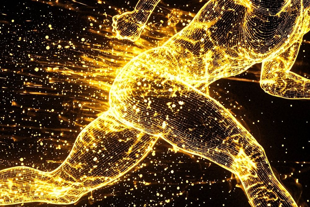 Dieses auffällige Design zeigt einen dynamischen Läufer in einer Explosion aus goldenem Licht und Energie. Die Linien und funkelnden Details schaffen ein futuristisches und kraftvolles Bild, perfekt für Liebhaber von Sport und modernem Design. Dieses Kunstwerk strahlt Bewegung, Kraft und Motivation aus und eignet sich daher ideal als Dekoration für Sport- oder Kreativräume. Hängen Sie es in einem Büro auf, um sich inspirieren zu lassen, oder in einem Schlafzimmer, um einen energiegeladenen Akzent zu setzen. Der Mix aus Gold und Schwarz sorgt für ein luxuriöses und modernes Aussehen, das Sie sicher beeindrucken wird.