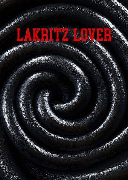 Dieses Bild zeigt eine kraftvolle, hypnotische Spirale aus glänzendem, schwarzem Lakritz, die sich tief ins Zentrum zieht und den Blick unweigerlich mitnimmt. Die plastische Struktur, das Lichtspiel auf der Oberfläche und der starke Kontrast zum dunklen Hintergrund lassen das Motiv beinahe greifbar wirken. Der rote Schriftzug „Lakritz…