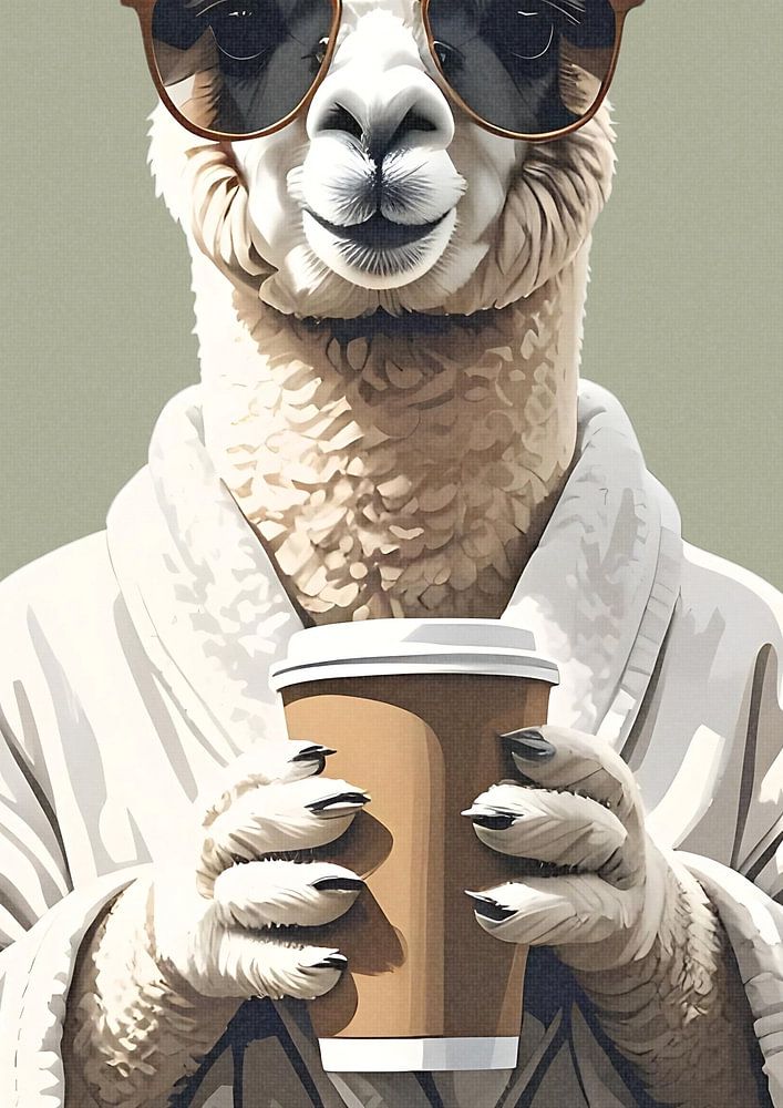 Dieses Lama trägt Sonnenbrille und Bademantel mit entspannter Selbstverständlichkeit – der Coffee-to-go fest in den Händen, der Blick selbstbewusst und gelassen. Die Kombination aus grafischer Klarheit, weichen Farben und tierischer Lässigkeit macht das Motiv zu einem stilvollen Statement für moderne Wände.