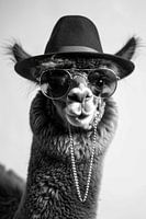 Ein Schwarz-Weiß Bild eines Lamas mit Sonnenbrille und einem Strohhut. Das Lama zeigt eine coole und lässige Pose in einer humorvollen Aufmachung.
