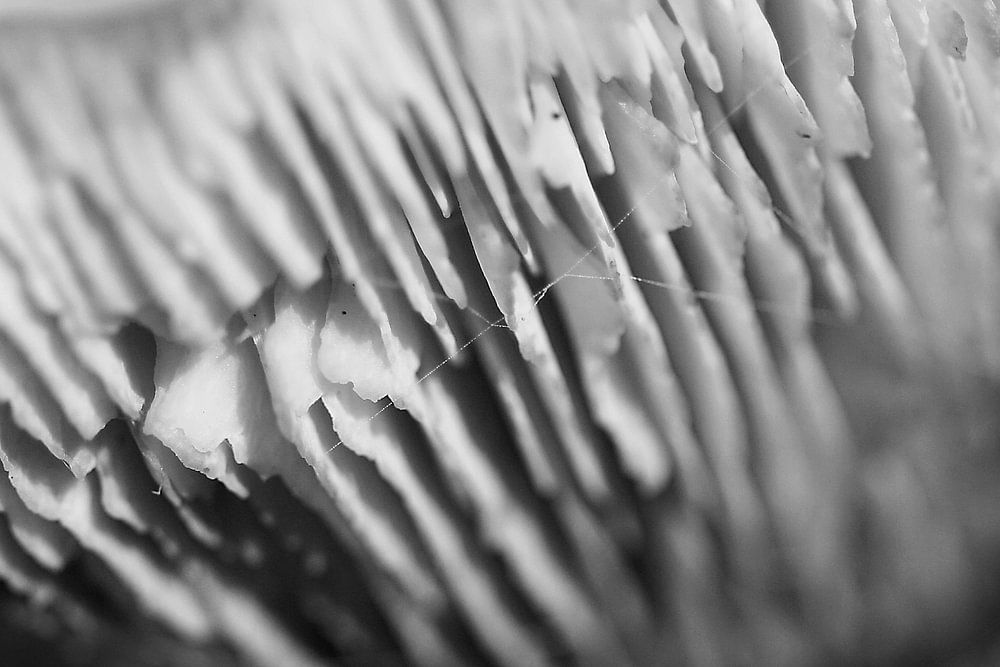 Close-up foto van de lamellen van een paddenstoel in zwart-wit. Genomen in de herfst tijdens een boswandeling.