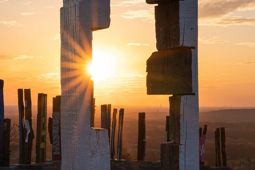 Die Landmarke Totems auf der Bergehalde der ehemaligen Steinkohlezeche Prosper Haniel, Wahrzeichen entlang der Route der Industriekultur im Herzen der Metropole Ruhr, Bottrop, Nordrhein Westfalen, Deutschland