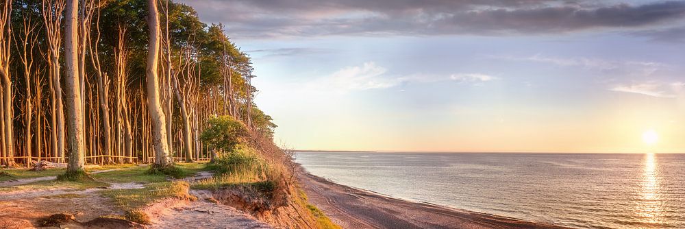 Die Ostsee bei Nienhagen mit Naturstrand und einem Wald direkt an der Steilküste zum Sonnenuntergang .