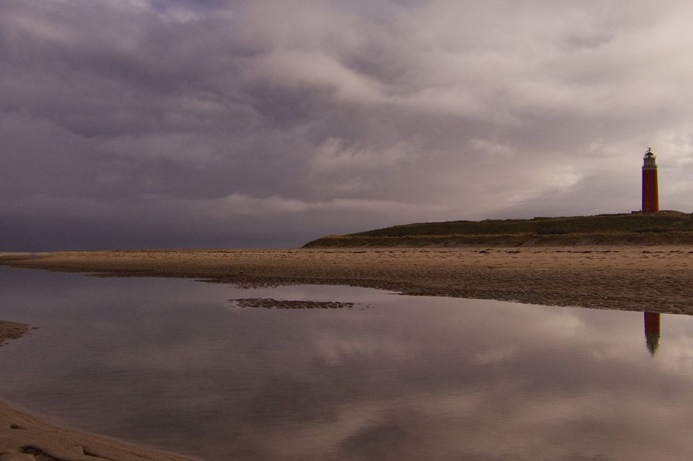 Foto vom Strand von Texel. Im Hintergrund ist der Leuchtturm zu sehen, der sich im Wasser spiegelt.