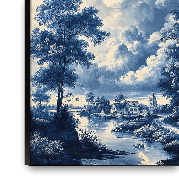 Altniederländische Szene eines kleinen Dorfes am Wasser. Mit bedrohlichem Wolkenhimmel und einem Teich oder Fluss mit Schwänen und Enten. Das Ganze ist im Delfter Blau-Stil gehalten. Es sieht aus wie ein Kunstwerk aus dem goldenen Zeitalter und würde in einem Museum nicht fehl am Platz wirken. Auch als Tapete wunderschön.