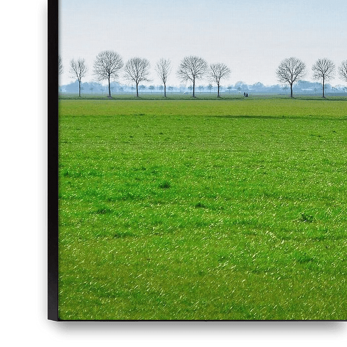 Eine minimalistische Fotografie einer Landschaft in Groningen. Eine grüne Graswiese mit einer Reihe kahler Bäume am Horizont. Darüber ein blauer Himmel mit einigen dunstigen Wolken. Eine typische Groninger Landschaft.