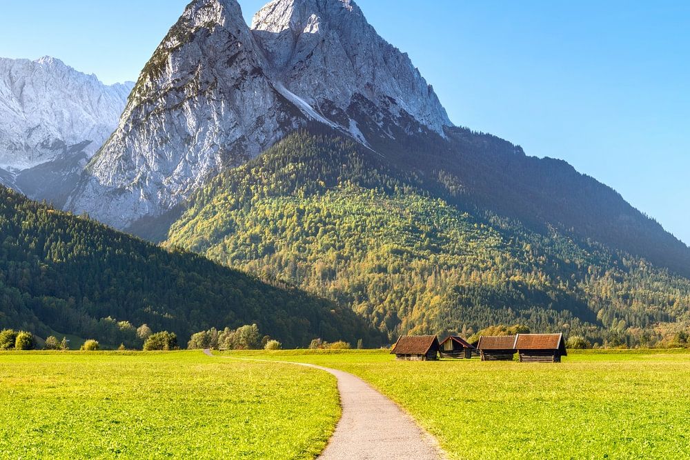 * Almwiesen bei Garmisch Partenkirchen * Wettersteingebirge mit mit schöner Wiesenlandschaft und kleinen Holzhütten auf der Alm bei Garmisch Patenkirchen und Grainau.