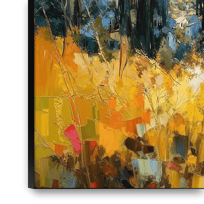 Eine toskanische Landschaft mit Dorf im Stil eines Gemäldes.