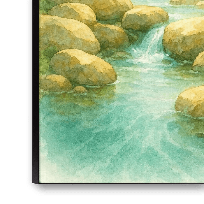 Dieses Gemälde zeigt einen sanft fließenden Gebirgsbach, der sich leise seinen Weg zwischen abgerundeten Felsen bahnt. Das Wasser schimmert subtil in Türkis- und Blaugrüntönen, die durch die transparenten, fließenden Aquarellschichten noch verstärkt werden. Auf der linken Seite neigt sich ein Baum mit seinen frischen, leuchtenden Blättern anmutig über das Wasser. Auf der rechten Seite wachsen Wildblumen und zarte Halme, ein kleines Detail, das dem Bild Natürlichkeit und Verspieltheit verleiht. Als ob man wirklich einen Moment stillstehen könnte, um es zu betrachten.