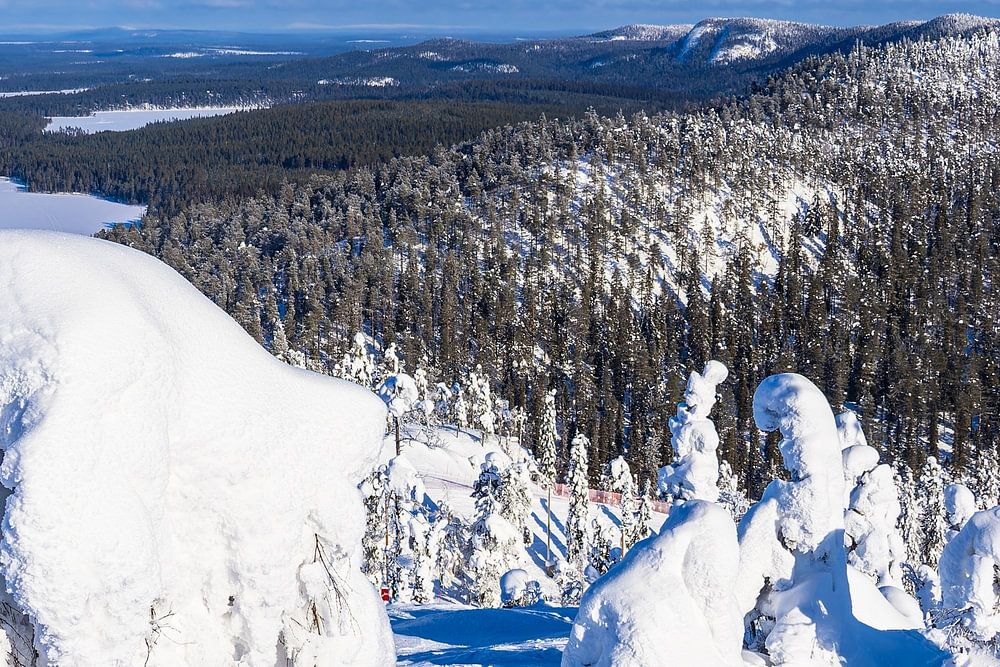 Landschaft mit Schnee und Bäumen im Winter in Ruka, Finnland.