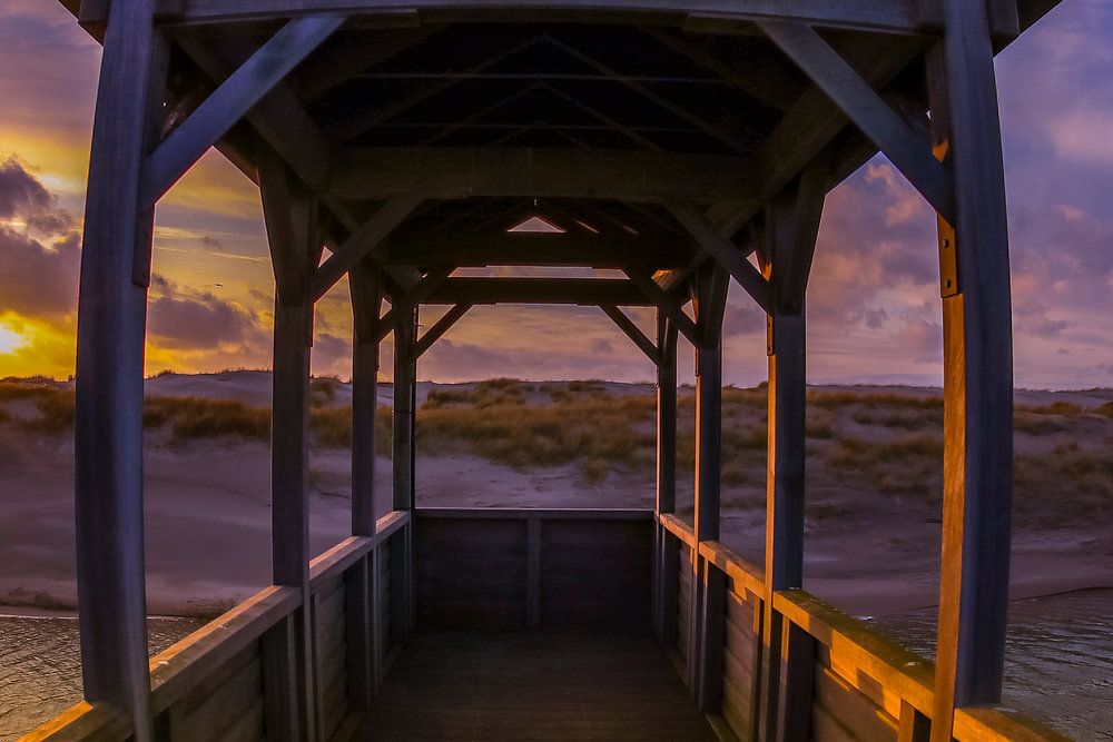 Der Hondsbossche und Pettemer Seedeich wurde 2015 mit 35 Millionen Kubikmetern Sand verstärkt und dann in Hondsbossche Duinen umbenannt. Dies ist ein Gerüst mit einem Dach in der Nähe von Camperduin.