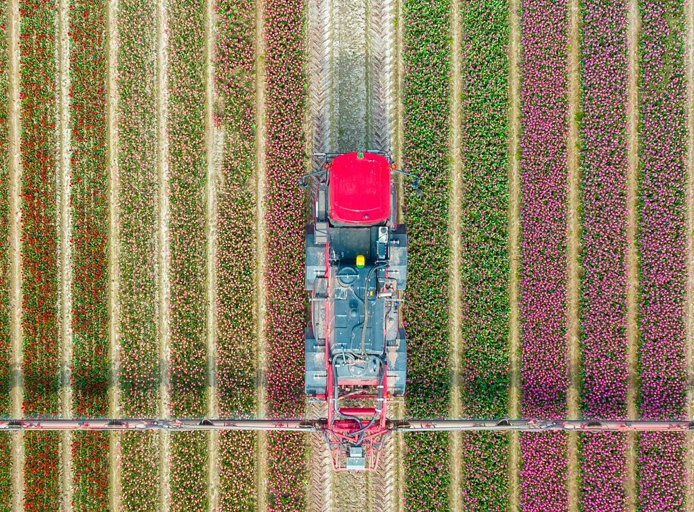Landwirtschaftliches Unkrautspritzgerät in einem Tulpenfeld im Noordoostpolder in Flevoland, Niederlande, im Frühjahr von oben gesehen. Der Noordoostpolder ist ein Polder in der ehemaligen Zuiderzee, der ursprünglich angelegt wurde, um mehr Land für die Landwirtschaft zu schaffen.