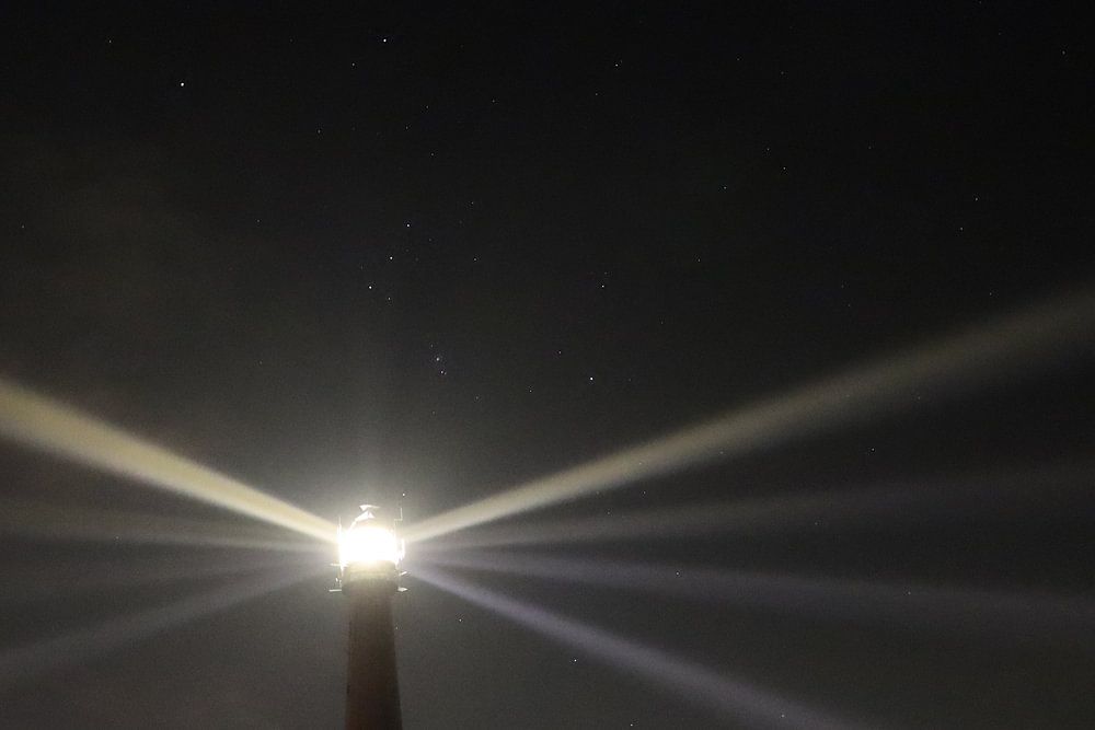 Ein Foto des Lange Jaap in Den Helder. Sie liegt an der Grenze zwischen dem Wattengebiet und der Nordsee. Alle 20 Sekunden sehen Sie vier Lichtstrahlen in einer Reihe, das ist der erkennbare Charakter dieses Leuchtturms.