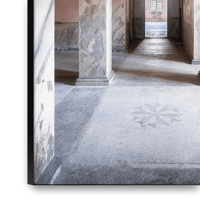 Dies ist das Bild eines schönen langen Korridors in einem weitgehend menschenleeren, verfallenen Gebäude. Details an der Decke und an den Säulen sind noch deutlich sichtbar. Dies war einst die Pracht eines Gebäudes.