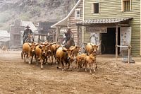 In einem nachgebauten Westerndorf werden Langhornkühe auf die Weide getrieben. Die jungen Kühe führen den Weg an.