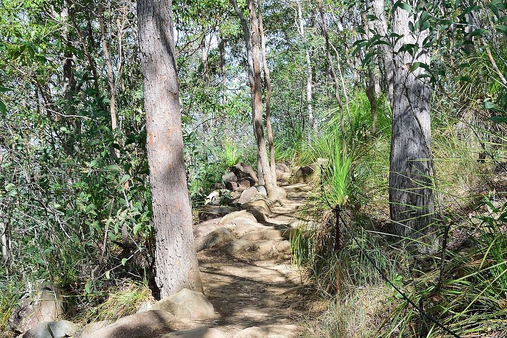 Langsam aber sicher erreichen wir unser Ziel, während wir den Ngungun-Berg in den Glass House Mountains, Queensland, Australien, besteigen. Schöner, aber steiler Aufstieg auf einem felsigen Pfad.