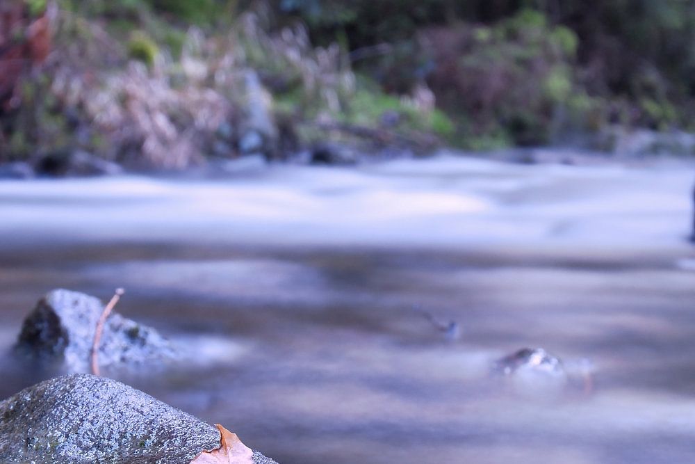 Langzeitbelichtung eines Flusses, Steine mit Blatt im Vordergrund. Waldhintergrund mit Bäumen in der Abenddämmerung