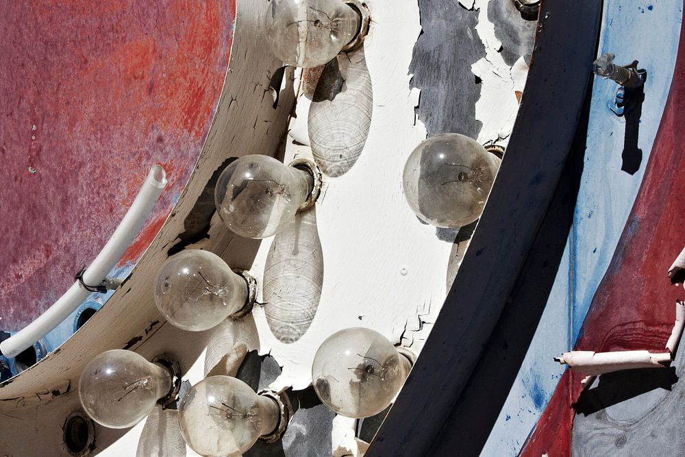 Las Vegas. Beschädigte Neon-Oldtimer-Werbeschilderung in einer friedhofsähnlichen Umgebung nahe dem Streifen von Las Vegas.