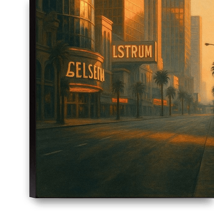 Diese eindrucksvolle Stadtlandschaft zeigt einen stilisierten Blick auf den Las Vegas Strip während der magischen goldenen Stunde. Hoch aufragende moderne Wolkenkratzer mit Glasfassaden reflektieren die glühend orangefarbene Sonne und stehen Schulter an Schulter mit vertikalen Leuchtreklamen im Vintage-Stil, auf denen…
