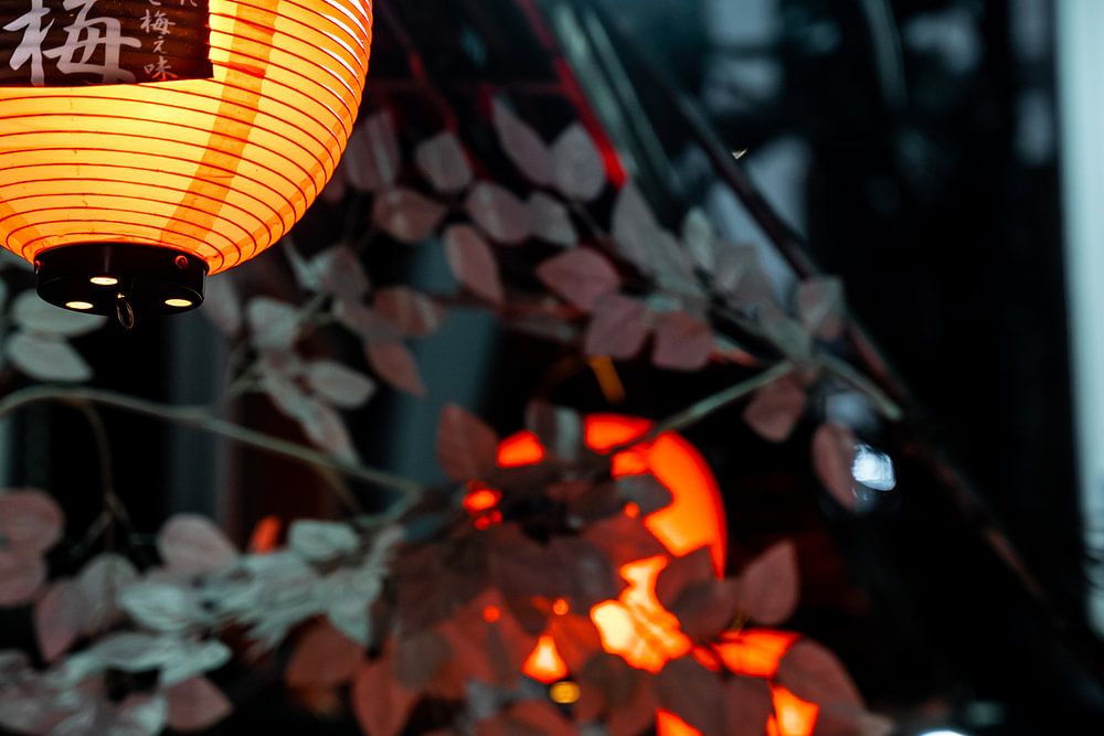 Reihe mit Laternen in einer Gasse in Shinjuku in der Stadt Tokio, Japan. Mit orangefarbenen hellen und weißen Blättern drum herum.