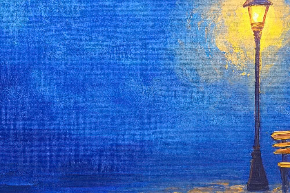 Sonnenuntergänge harmonieren mit tiefblauen Himmeln, während eine einsame Bank unter dem sanften Schein einer Laterne Platz für Träume bietet. Diese ruhige Szenerie strahlt Gemütlichkeit und Frieden aus und lädt zum Verweilen ein. Perfekt für das Wohnzimmer, wo sie entspannende Gespräche und stille Momente der Reflexion inspiriert.