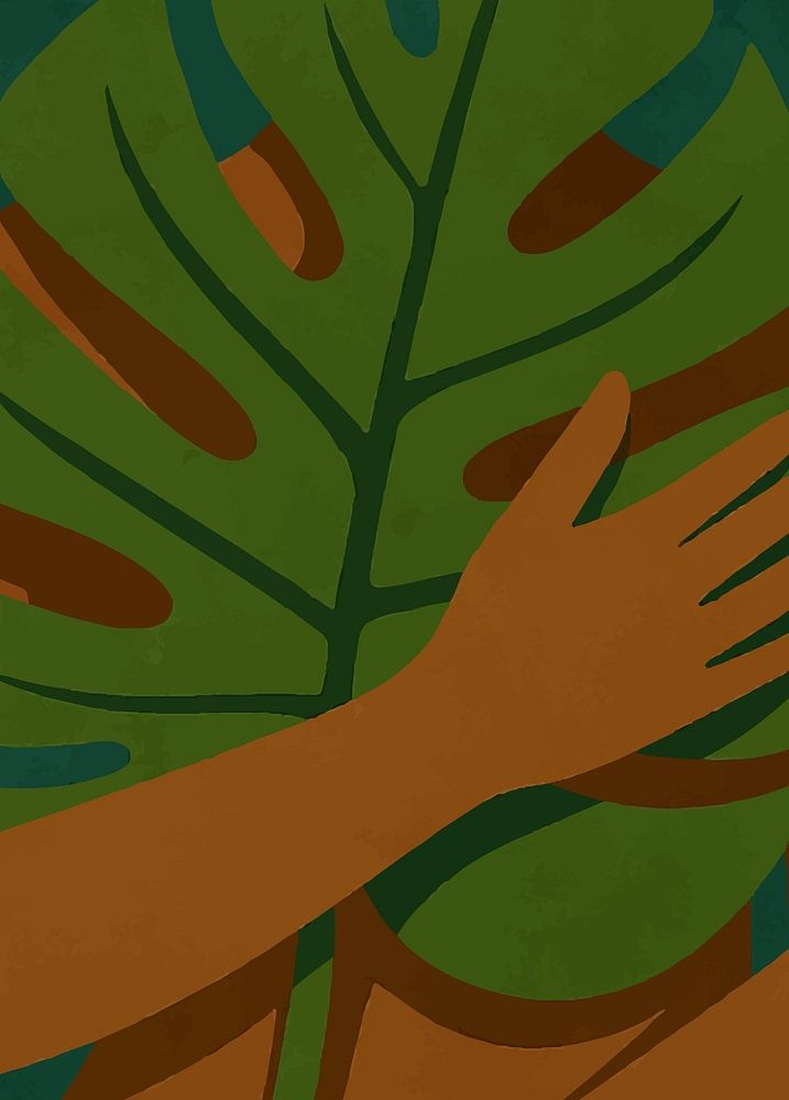 Eine moderne flache Illustration einer Frau, die sich an ein großes Monstera-Blatt schmiegt, mit einer Mischung aus erdigen Grün- und Brauntönen für ein von der Natur inspiriertes Kunstwerk.