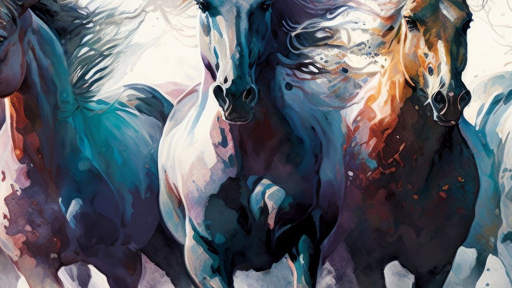 Das Aquarell zeigt eine lebendige Szene mit rennenden Pferden, die mit voller Geschwindigkeit vorbeieilen. Die Farbpalette besteht aus weichen Pastellfarben, die perfekt miteinander verschmelzen, um das Gefühl von Bewegung und Geschwindigkeit einzufangen. Die Pferde sind in verschiedenen Posen dargestellt, ihre Mähnen und Schwänze flattern im Wind, während sie sich kraftvoll vorwärts bewegen. Die Szene ist mit subtilen Pinselstrichen versehen, die der Darstellung der Pferde und ihrer Umgebung Textur verleihen. Die Andeutung von Bewegung wird durch die dünnen und transparenten Aquarellschichten noch verstärkt, die dem Bild eine weiche und verträumte Atmosphäre verleihen. Das gesamte Werk strahlt ein Gefühl von Freiheit und Energie aus und lädt dazu ein, die wilden, anmutigen Bewegungen dieser majestätischen Tiere zu beobachten.