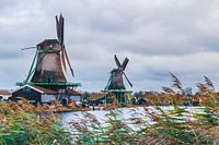 Das Freilichtmuseum Zaanse Schans in Zaandijk. Das Foto zeigt 2 der Windmühlen - die Farbmühle De Kat & die Holzsägemühle die gekrönte Poelenburg entlang der Zaans an einem stimmungsvollen Herbsttag. Die Farben des Schilfs im Vordergrund bilden einen schönen Kontrast.