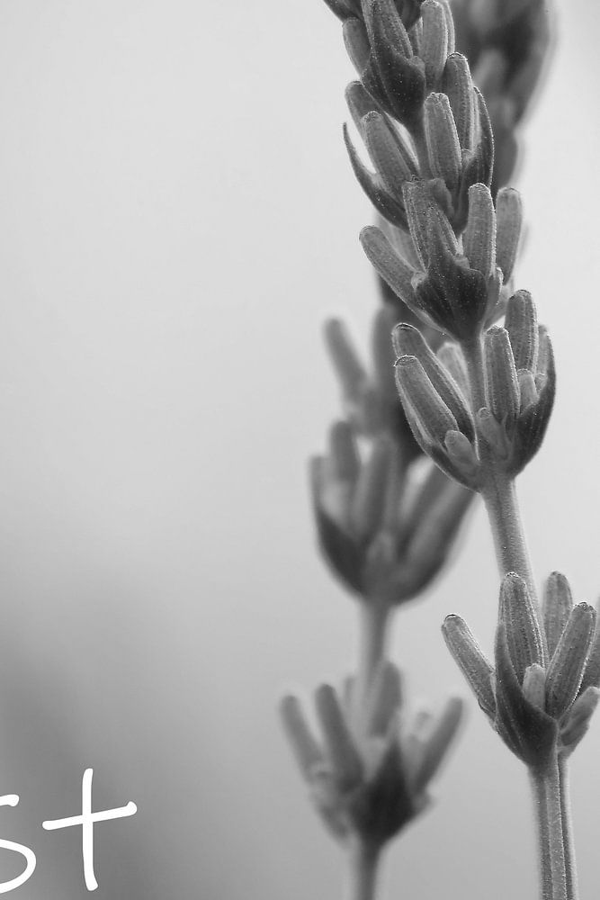 Ein Bild von Lavendel in schwarz weiß. Ein Spruch oder Text: just smile. Makrophoto.