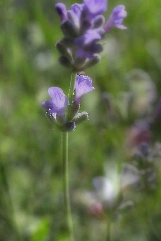 Ein digital bearbeitetes Foto von Lavendel, das wegen seiner leicht dunklen Darstellung der Lavendelheide mit viel Grün und einigen schönen Lavendelstacheln zu einem einfachen oder ländlichen Stil passt.