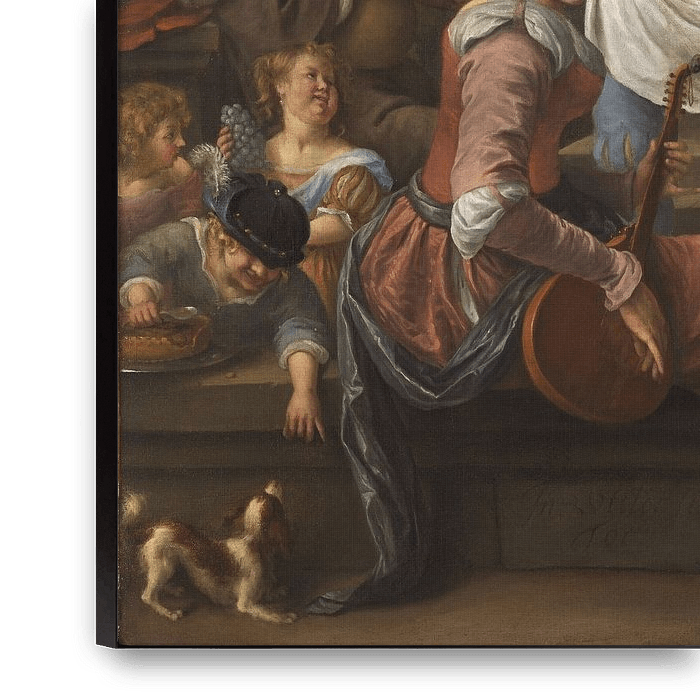 "In weelde siet toe" (In Luxus hüte dich), das Sprichwort, das Jan Steen zu seinem Gemälde inspirierte, ist auf der Bank im Vordergrund buchstäblich in Stein gemeißelt. Auf dieser Bank sitzt eine verführerische Bacchanalistin, die, von Weinreben umrankt, auf ihrer Flöte klimpert und den Betrachter beschwörend anschaut, als wolle sie ihn einladen, an dem Fest teilzunehmen. Der große Trinker hinter ihr, der einen roten Hut mit einer Hahnenfeder trägt, hebt lächelnd ein Glas Wein in der einen Hand, während er mit der anderen einen Krug dicht an seiner Seite hält. Die festliche Musik, die von der Frau, dem Dudelsackspieler und dem Flötenspieler dargeboten wird, könnte nicht sehr harmonisch klingen, aber man spürt, dass die Qualität der Musik nicht ihre Hauptsorge war.