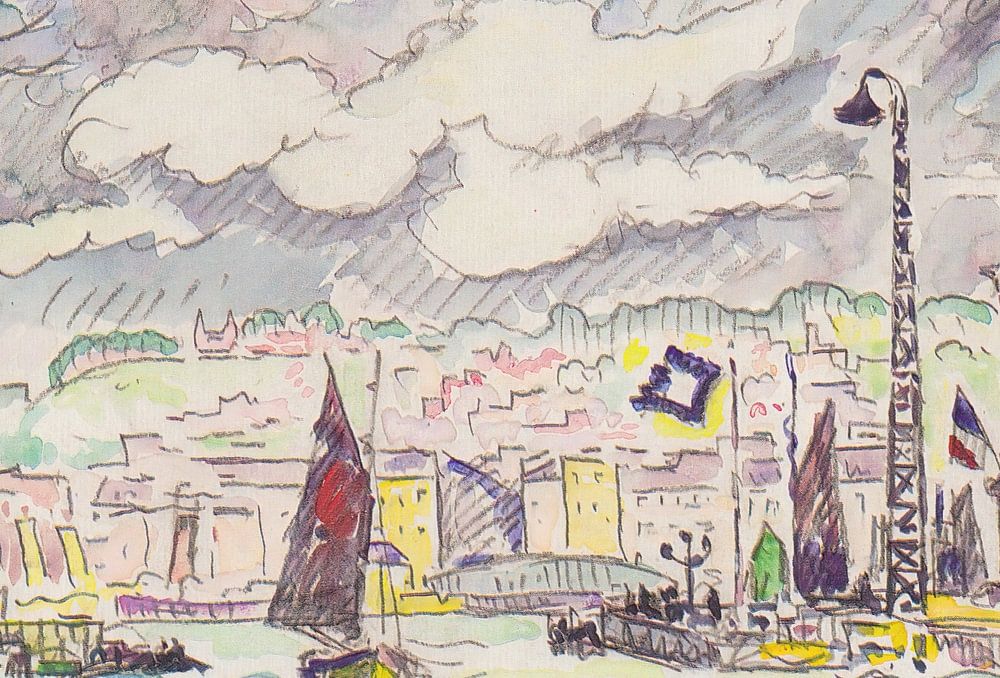 Bei der Kreideaquarelltechnik werden Kreide oder Pastellkreide auf das Papier aufgetragen, bevor die Aquarellfarben verwischt werden, wodurch komplizierte Details und reiche Texturen entstehen. Signacs akribischer Ansatz und seine Liebe zum Detail zeigen sich darin, dass er die Schiffe, Gebäude und natürlichen Elemente mit Präzision und Finesse darstellt.