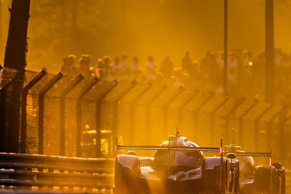 Goldene Stunde oder Sonnenuntergang während des 24-Stunden-Rennens von Le Mans in Frankreich. Das Foto wurde am Ende der Indianapolis-Geraden aufgenommen, kurz bevor die LMP-Fahrzeuge nach links in Richtung Arnage abbiegen.