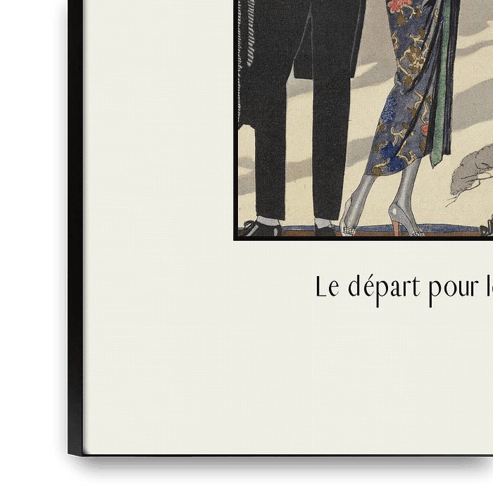 Ein historischer Modedruck mit einem modernen Twist: "Le départ pour le casino". Inspiriert vom Art Deco, einer Stilrichtung, die in den 1920er Jahren entstand. New Businessmanship gemischt mit modernen klaren Linien und Farben.
