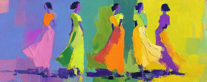 Vibrant Movement – Dies ist ein modernes Tanzgemälde mit fünf Frauen in lebhaften, farbenfrohen Kleidern, die sich elegant bewegen und ein Gefühl von Energie und Freude ausstrahlen, mit auffälligen Farben wie Rosa, Gelb und Grün.