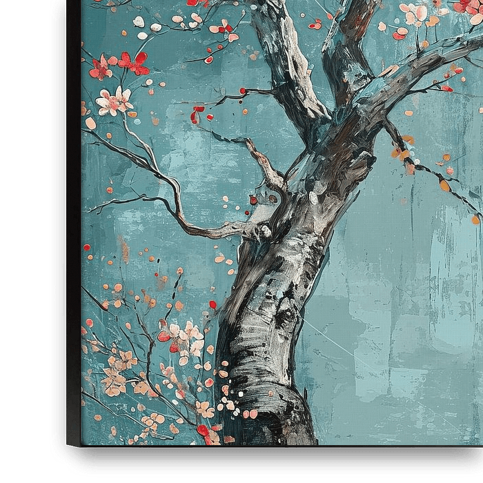 Vibrant Blossom - Mit einer verspielten Palette leuchtender Farben bringt dieses Gemälde eines blühenden Baumes die Natur in die Wohnung. Die organischen Formen und der Kontrast zwischen den warmen Rosa- und Rottönen der Blüten und dem kühlen, beruhigenden blauen Hintergrund schaffen ein dynamisches und doch harmonisches Gleichgewicht.…